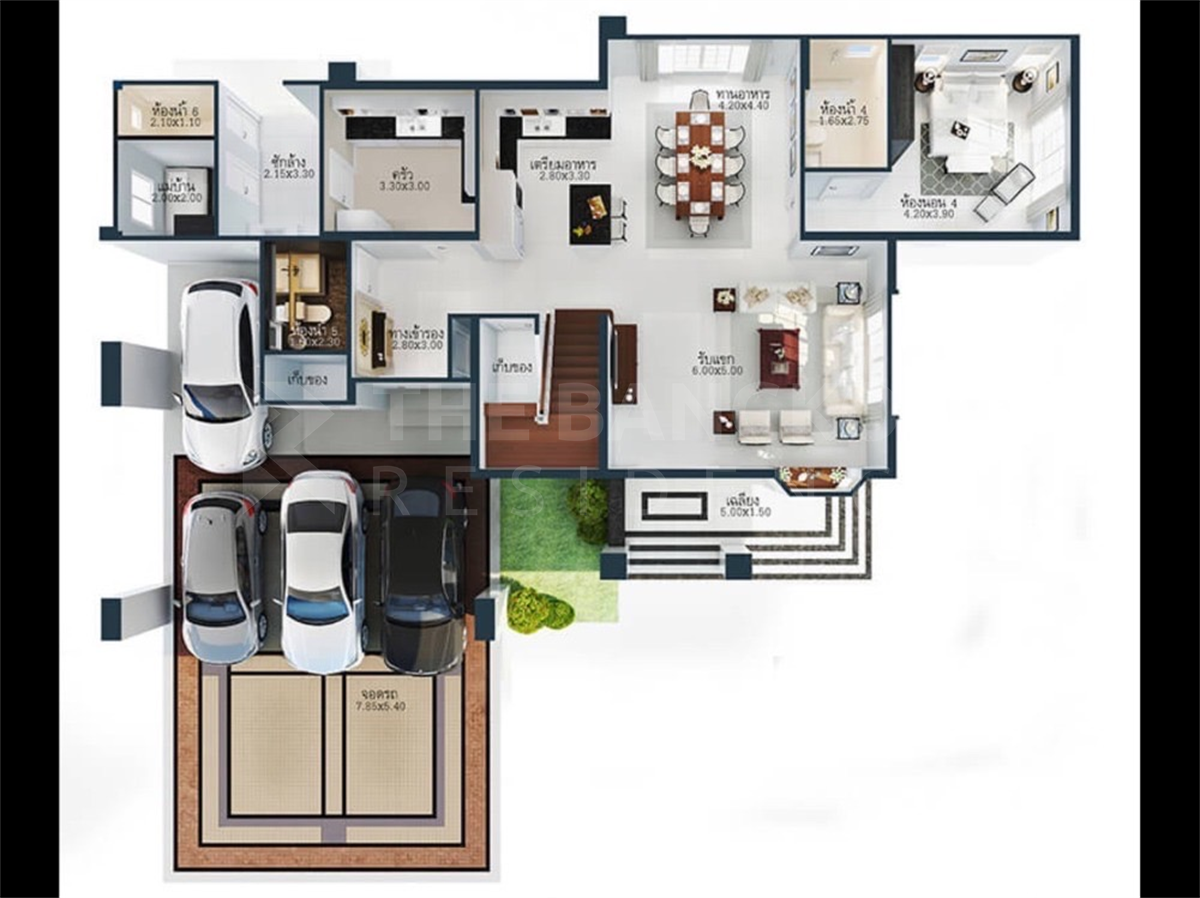 Кладовая 1, тайская кухня, 1 многофункциональная комната, 1 кладовая, 1 комната для прислуги, парковка на 4 машины.
