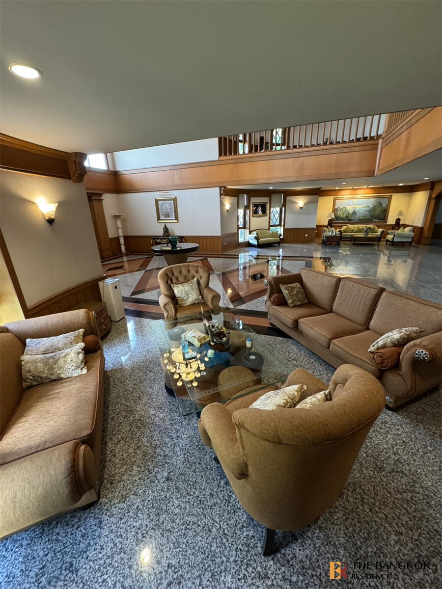 เนื้อที่ดิน 3 ไร่ ครึ่ง พื้นที่ใช้สอย 1,600 ตรม. โถงรับแขก Floor to Ceiling สูง 8 เมตร มี 6 ห้องนอน/ห้องน้ำในตัว ชั้นบนมี 5 ห้องนอน ชั้นล่าง 1 ห้องนอน ห้องแม่บ้าน 3 ห้อง มีห้องน้ำแม่บ้าน 2 ห้อง จอดรถได้ 6-7 คันครับ ห้องนั่งเล่น ตกแต่งอย่างสวยงาม หรูหรา Living room ล่างมี 3, ข้างบน 1 โซน Dinning รองรับแขกได้ 20 คน ครัวมีขนาดใหญ่ Island Bar พื้นไม้และบันไดไม้สักแท้
